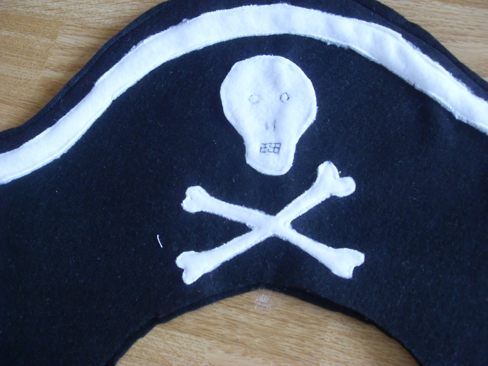 A pirate hat was requested, and though it initially caused me some head scratching I loved the end result! black felt and white fleece, with black embroidery thread for the skull details.